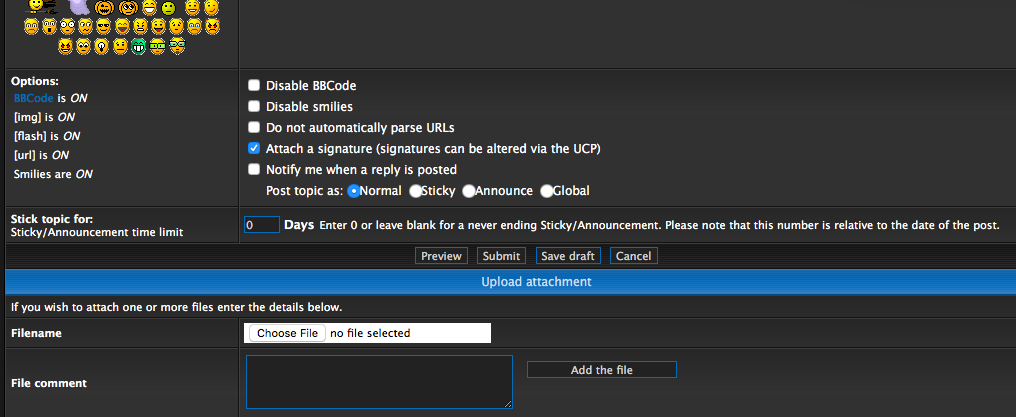 Scroll down until you see the 'upload attachment' box beneath the 'preview'/'submit'/etc buttons: