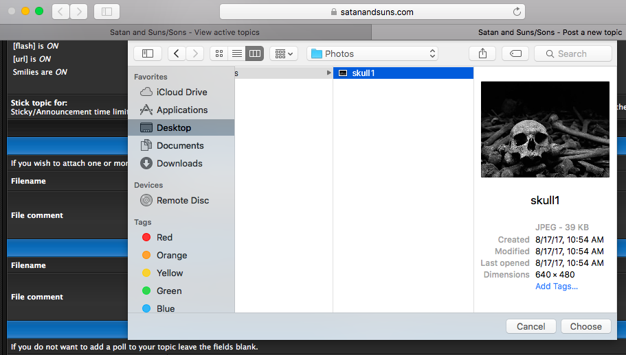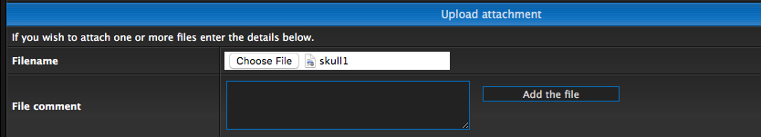 Navigate through your folder directory to the file you want to upload then click on it and submit it. The window will disappear and you will see the upload attachment section now has the name of your file, like this (mine is named 'skull1'). Click on the 'Add the file' button to the right: