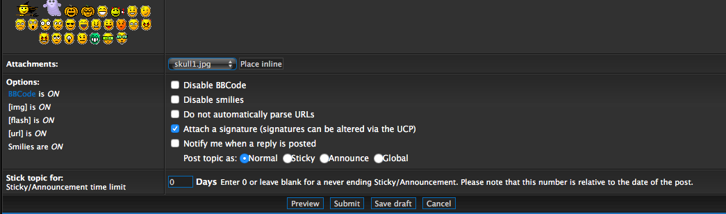 And then you will see above the 'preview'/'submit'/etc buttons your file name (mine is again 'skull1') next to a button that says 'place inline':
